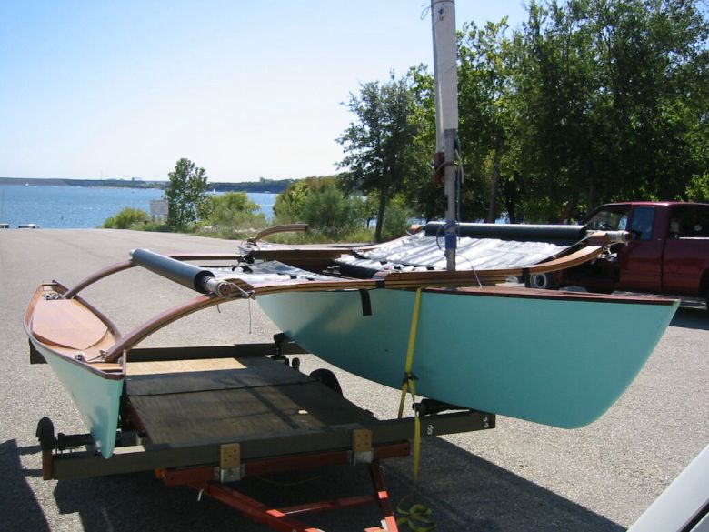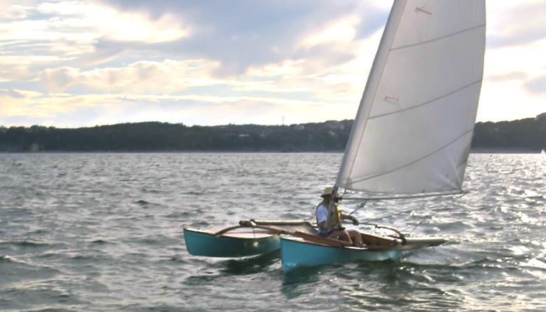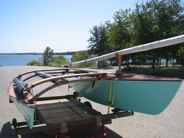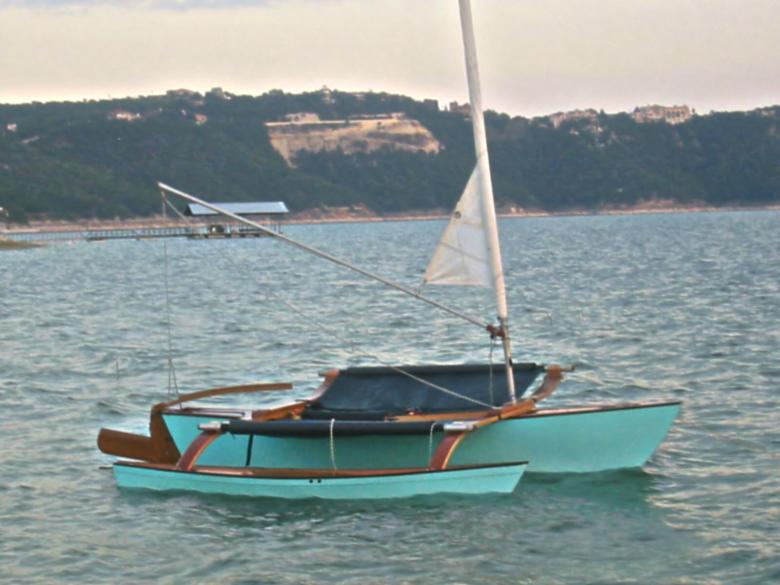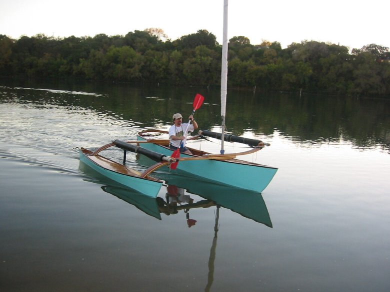 These goals made me look at multihulls. I had seen dugout canoes on the Rio Dulce fitted with outboards that were quite fast. Why not design a long, skinny hull with an outrigger and make it a real sailboat that was capable of good speed under power also. I saw photos of traditional Polynesian outrigger canoes. I liked the design. But car topping one and setting it up to sail with all that lashing to hold the outriggers on looked too time consuming. I wanted a boat easy and quick to set up, with no tools.