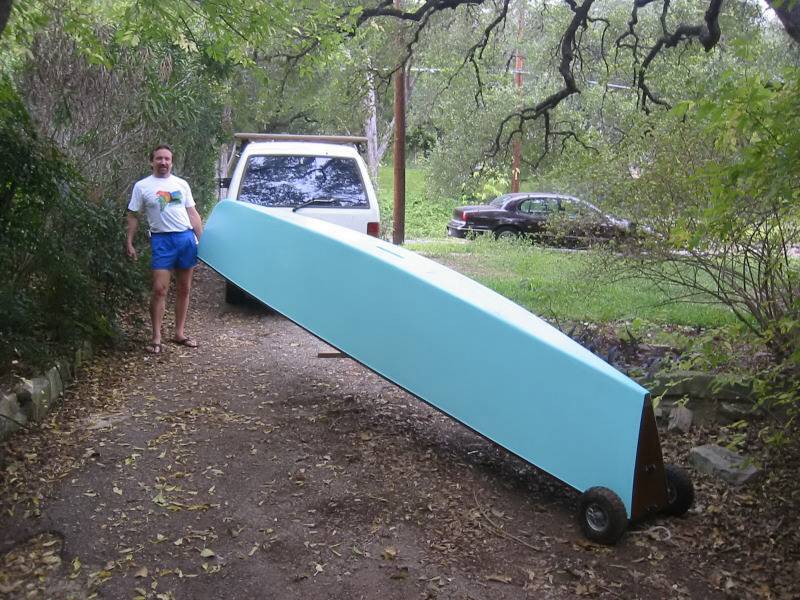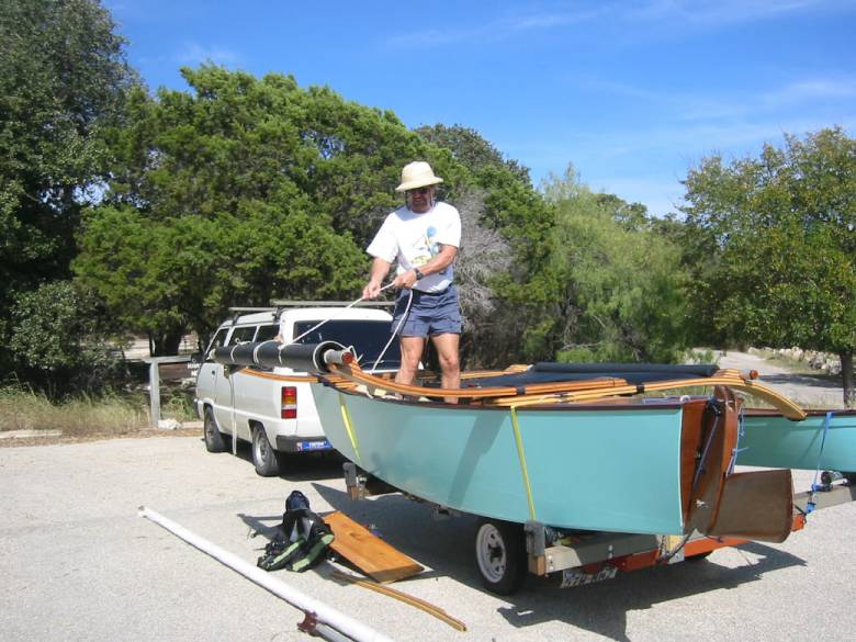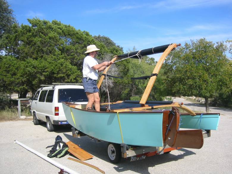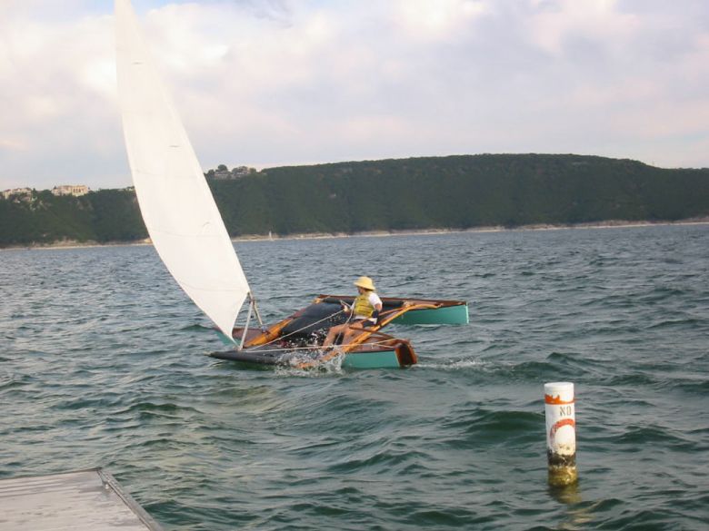Flaquita (Spanish for skinny little girl), was designed and built to be a lightweight, car toppable, fast, safe sailboat that can be paddled, sailed or motored. I looked all over for plans for a boat that was similar to this. I found none. I would have been happy to purchase some plans. It’s a heck of a lot easier building a boat with plans, rather than having to design from scratch. I wanted a boat that I could strap on top of my car, or haul on a small trailer, and travel to far away shores. Once I got there, I wanted a boat that could be unloaded and launched by one person. And could be launched without using a boat ramp, if none were available. I had built a sailing dinghy before. It was a Bolger design Cartopper. I cartopped it from Texas to the Pacific Northwest as far north as Desolation Sound British Columbia. I sailed it in the Florida Keys. I traveled as far south as Rio Dulce, Guatemala. It is a terrific little boat, but it has some serious limitations. It sails great. It rows great. But with its rounded bottom, it's a dog under power. It also has quite low freeboard. That, combined with the lack of a self-bailing cockpit, made it less than safe in rough water. It would never sink, but if turned over in deep water, righting it and getting back in and sailing away seems improbable. I wanted an improved boat. I wanted a boat that was: